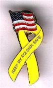 Description: 1 1/4" Keep My Soldier Safe " Ribbon Pin Iron Enamel. These lapel pins are die